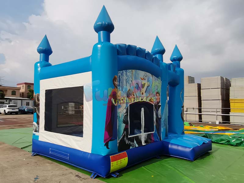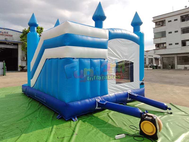 Ce château gonflable en gros présente des détails de conception exquis. Fabriqué en PVC bleu et blanc éclatant, il est à la fois stable et flexible, garantissant la sécurité des enfants. Deux entrées d'air bleues à la base assurent un gonflage efficace tout en améliorant la stabilité structurelle. De plus, des fenêtres en filet assurent une excellente circulation de l'air, tandis que les flèches renforcent son esthétique féerique, garantissant sécurité et confort aux enfants tout au long de cette expérience de jeu immersive.
