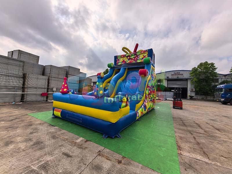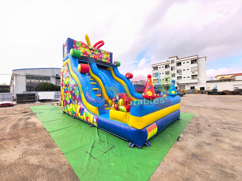 Le toboggan gonflable commercial est recouvert d'imprimés de ballons colorés de différentes tailles, aux dégradés de couleurs et à la texture finement imprimée et légèrement brillante. Le motif de ballons recouvre toute la surface du toboggan et ses côtés, sans aucun espace vide visible, créant ainsi une ambiance immersive et ludique. Les couleurs sont très saturées et résistantes à la décoloration.