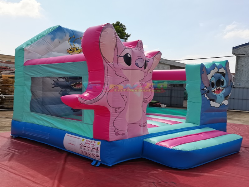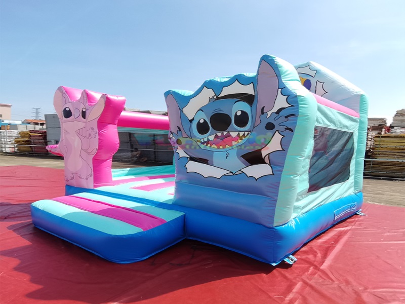 Point maison gonflable gonflable Incarne le concept d'une aire de jeux interstellaire originale. Ses couleurs vibrantes, ses personnages de dessins animés tridimensionnels et sa structure ingénieuse créent une aire de jeux pour enfants visuellement saisissante. Les marches d'entrée, ornées de rayures bleues et roses, rehaussent la palette de couleurs et créent un rituel pour les enfants qui entrent. Des fenêtres transparentes sur les parois latérales assurent la transparence pendant le jeu et ajoutent une touche de charme à l'ensemble. Une fois gonflé, le château gonflable prend une forme tridimensionnelle et complète, tandis que l'impression vibrante et détaillée de sa surface assure une intégration harmonieuse de Stitch et Angie. Chaque ligne et chaque couleur évoquent avec précision le style d'animation, incarnant l'univers joyeux de Lilo Stitch dans ce château gonflable.
