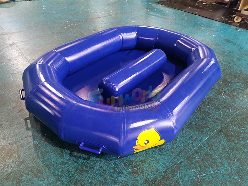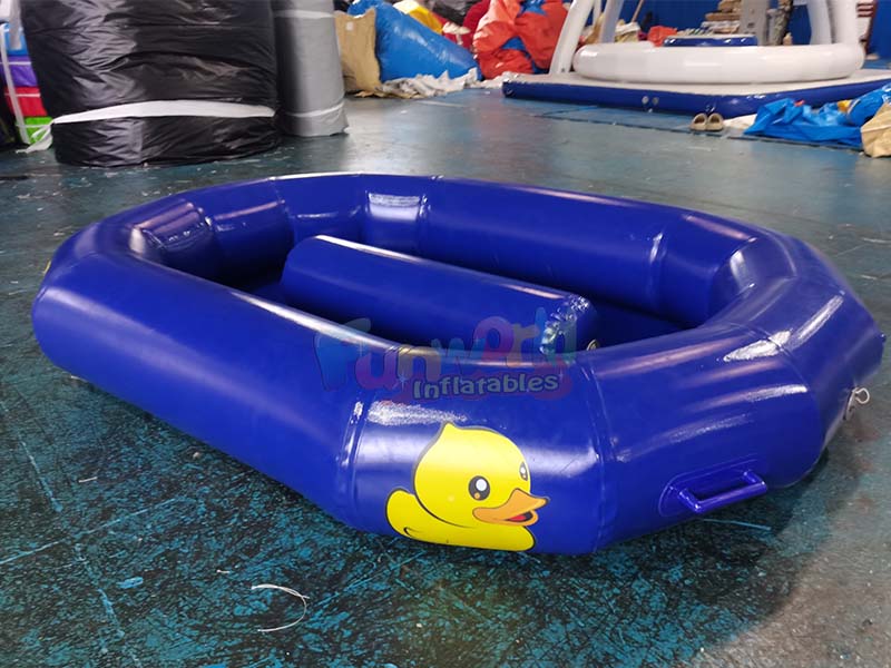 Canard gonflable de pêche au gibierCe modèle bleu présente une forme d'anneau fermé arrondie, presque carrée. Fabriqué en PVC brillant et résistant, il offre une sensation de robustesse. Une colonne gonflable cylindrique est située au centre de l'anneau, tandis que des blocs de marquage jaunes sont répartis sur le pourtour. Des poignées violettes sont placées à plusieurs coins pour une prise en main facile.