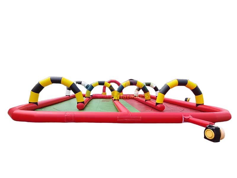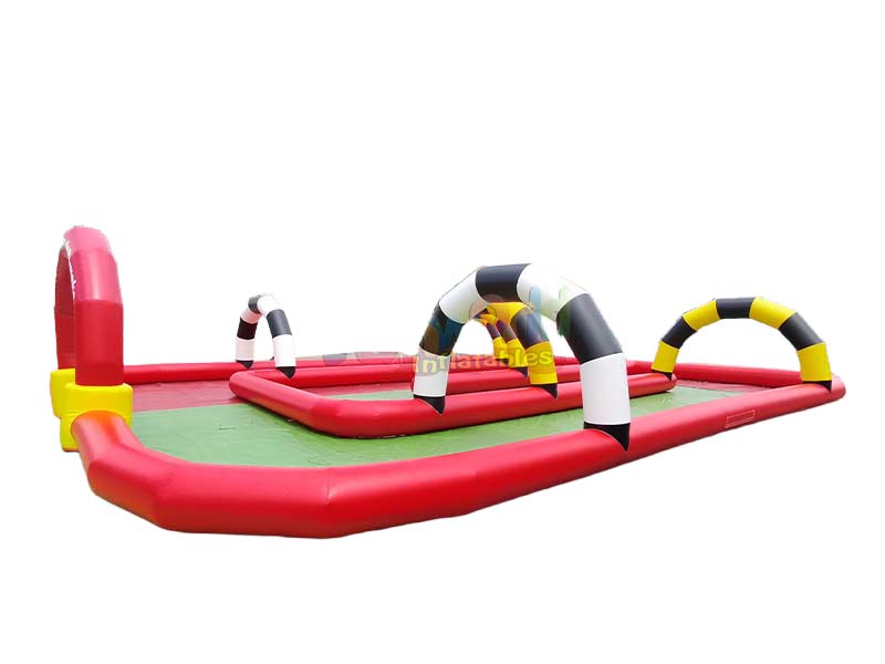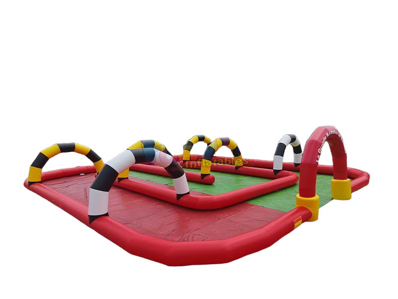 Ce Piste de voiture gonflable commerciale Transforme n'importe quel espace en un paradis de course palpitant pour les enfants. Le circuit, agrémenté de sections rouges éclatantes et d'arches rayées uniques, crée un tracé captivant. Les enfants peuvent piloter leurs véhicules miniatures le long du circuit, franchir des portes colorées et atteindre la ligne d'arrivée, pour une aventure de conduite amusante et stimulante.