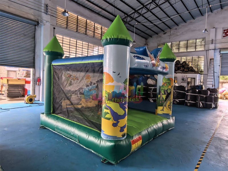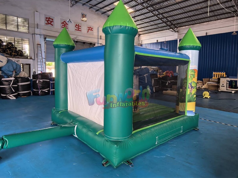 Le château gonflable dinosaure repose sur quatre tours robustes surmontées de tourelles coniques vert émeraude, lui conférant une silhouette majestueuse, digne d'une forteresse. Son extérieur est un régal pour les yeux, orné de graphismes numériques haute définition représentant des dinosaures sympathiques au style cartoon.