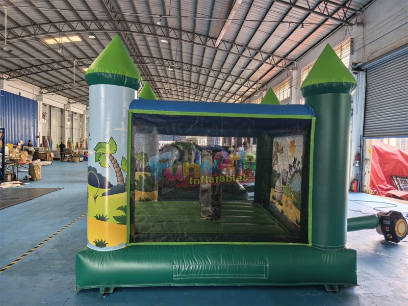 Ce château gonflable dinosaure aux couleurs vives est une aire de jeux préhistorique conçue pour stimuler l'imagination de tous les jeunes explorateurs. Alliant le charme classique d'un château à une touche « Jurassique » dynamique, ce gonflable arbore une palette de couleurs saisissante, mêlant vert forêt et bleu ciel, rehaussée par des surfaces de rebond vert citron éclatantes.