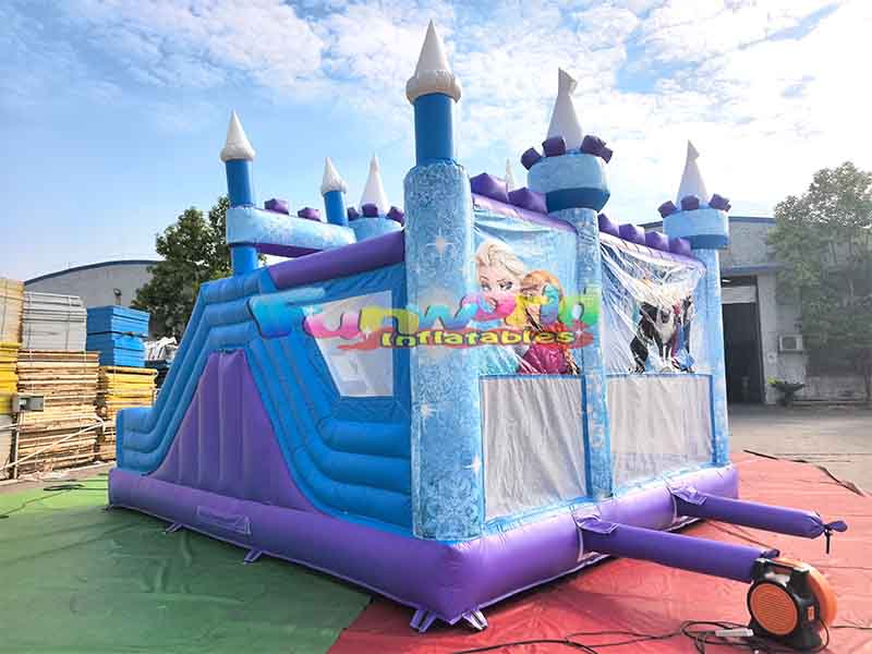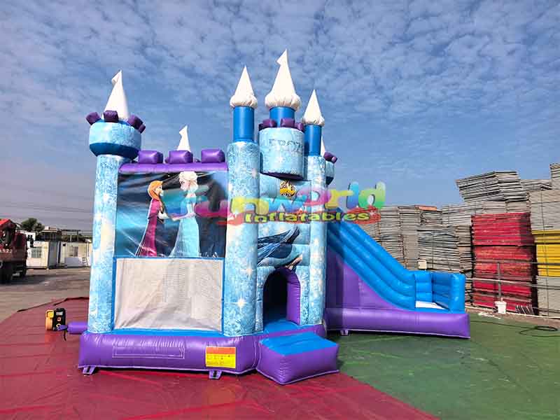 Château gonflable pour enfantsIl présente une architecture de château à plusieurs sommets, avec des flèches blanches au sommet des tours, des décorations violettes et des colonnes bleues qui mettent en valeur la structure tridimensionnelle des tours, recréant ainsi le style du château du dessin animé. Un toboggan gonflable aux couleurs bleu et violet, aux lignes épurées, est fixé sur l'un des côtés du château.