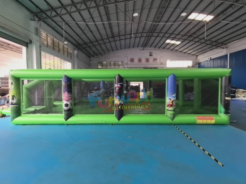 Des filets à mailles haute tension sont intégrés aux panneaux latéraux, offrant une excellente visibilité aux spectateurs tout en maintenant le ballon à l'intérieur du périmètre. Les extrémités du terrain sont équipées de poteaux de but gonflables intégrés, également munis de filets, créant ainsi une cible stable et sans faille pour les attaquants. Malgré son encombrement important, la structure se dégonfle pour un transport aisé et se monte en quelques minutes grâce à un puissant gonfleur électrique.