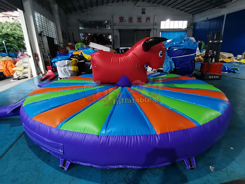 Cette attraction haute en couleur comprend un grand tapis gonflable multicolore, souvent de 5 mètres de diamètre, qui sert de zone d'atterrissage douce et sécurisée pour les participants lorsqu'ils sont inévitablement éjectés du taureau rouge central. Contrairement à son homologue mécanique, cette version est généralement actionnée manuellement, ce qui ajoute une dimension interactive et souvent hilarante pour les spectateurs comme pour les participants. Quatre cordes sont généralement fixées à la base du taureau ; amis ou membres de la famille tirent dessus dans différentes directions pour le faire cabrer, tourner et se balancer, mettant à l'épreuve l'équilibre et la détermination du participant. Cette activité autonome favorise le travail d'équipe et la confiance en soi dans un environnement sécurisé.