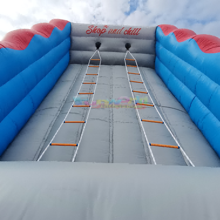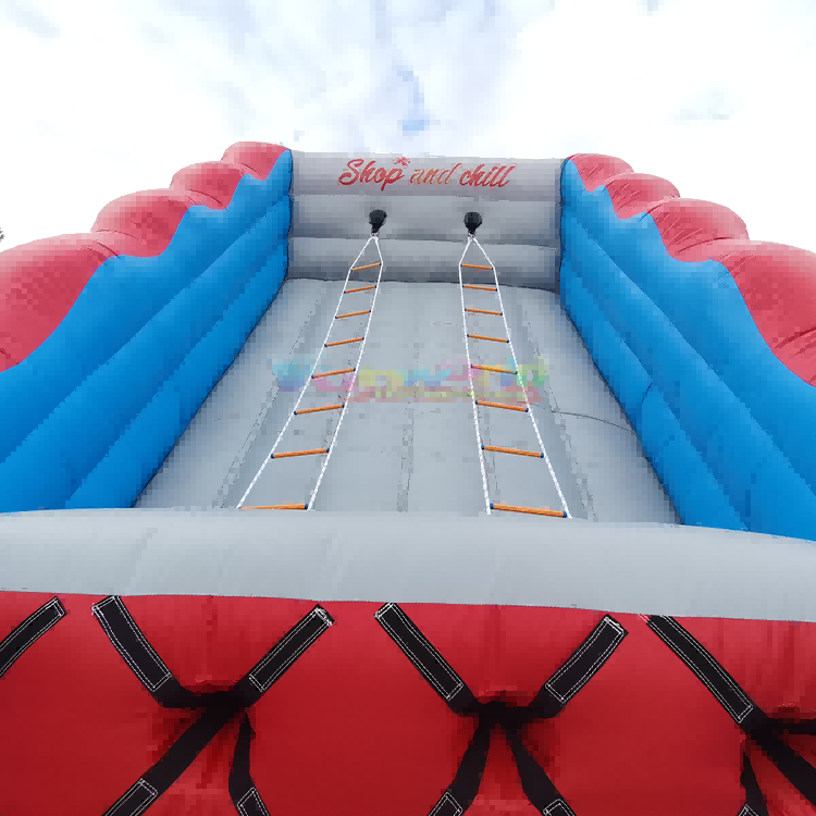 Ce jeux d'escalade d'échelle gonflable Ces structures, aux couleurs rouge, bleu et gris, sont équipées d'échelles de corde doubles et oscillantes. Elles mettent à l'épreuve l'équilibre, la coordination et la détermination des participants qui s'affrontent pour atteindre le sommet. Contrairement aux échelles fixes, ces échelles sont fixées aux deux extrémités, ce qui les fait pivoter et tourner pendant l'ascension, provoquant des chutes quasi inévitables et hilarantes. Malgré le défi, la sécurité est primordiale. L'ascension, à haut risque, se déroule entièrement au-dessus d'une base gonflable souple et rembourrée, conçue pour amortir les chutes. Fabriquées avec des matériaux résistants et mesurant généralement environ 30 cm de large, ces structures conviennent aussi bien à une utilisation intérieure qu'extérieure.