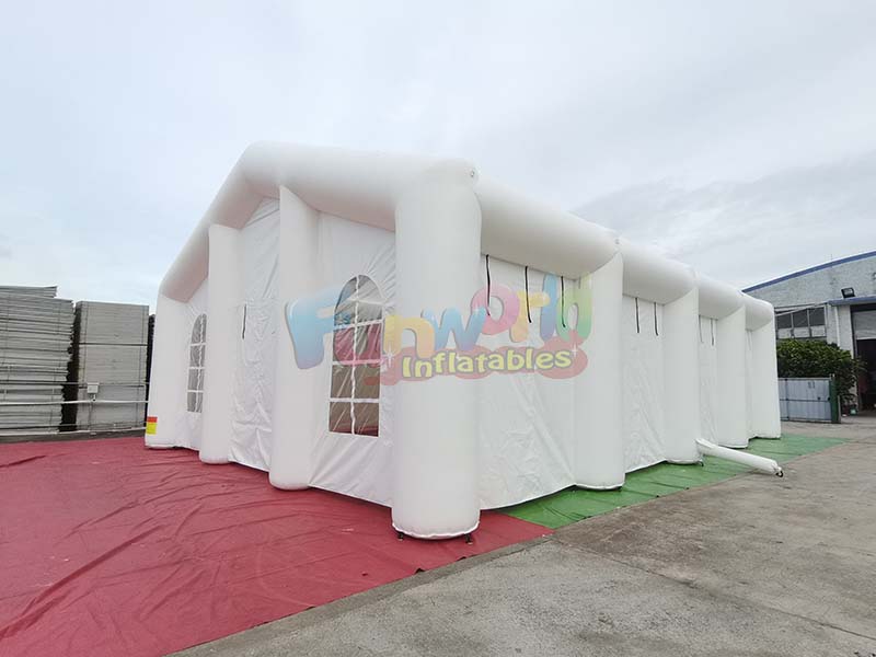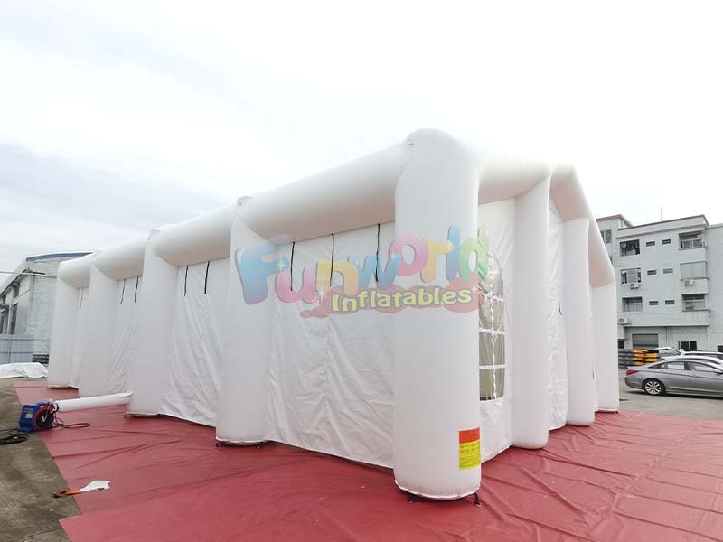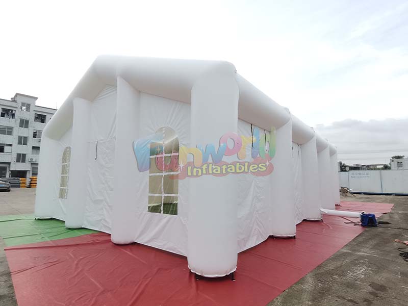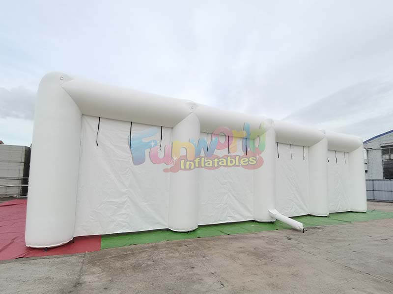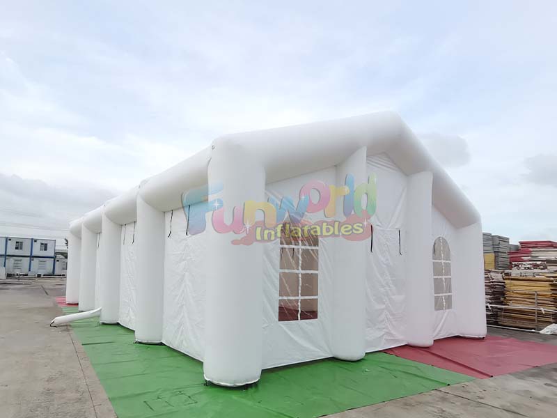 tente gonflable de mariageSon design unique repose sur une structure gonflable composée de plusieurs piliers blancs robustes, régulièrement espacés, soutenant un toit arqué et lisse, ce qui lui confère une allure soignée et sophistiquée. La bâche blanche épaisse et texturée qui recouvre la surface de la tente se gonfle uniformément, créant une façade plane et résistante. La couleur blanche immaculée, à la fois simple et élégante, la rend particulièrement attrayante en extérieur. Elle offre également une excellente adaptabilité, s'intégrant parfaitement à divers contextes, des événements commerciaux et festifs en plein air aux situations d'urgence.