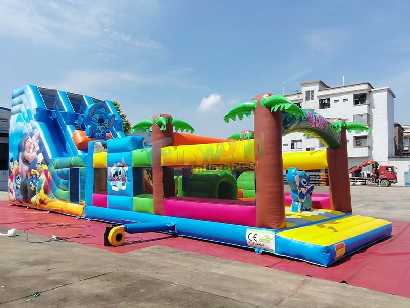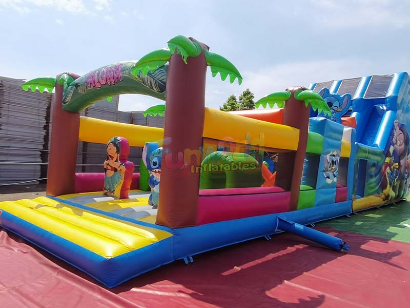 Toboggan gonflable géant commercial L'ensemble crée une ambiance immersive et enfantine. La zone principale met en scène des personnages de dessins animés, avec des figures classiques comme Stitch apparaissant sous différentes formes, et Lilo, sous sa forme animée, qui interagit avec Stitch et recrée parfaitement l'esprit joyeux du dessin animé. L'utilisation récurrente de palmiers et la présence dense de personnages contribuent à créer une scène immersive où l'on explore une île tropicale avec Stitch et Lilo.