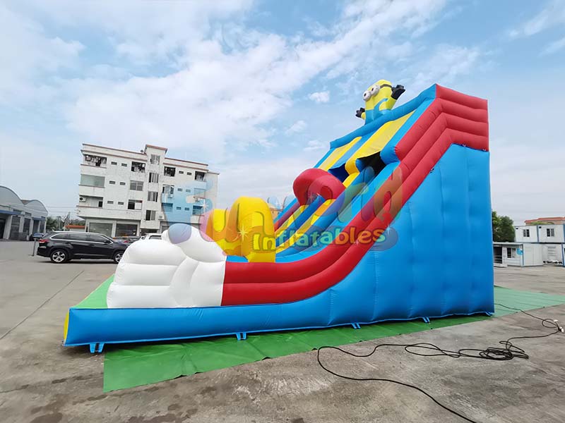 Le toboggan gonflable Minions est fabriqué à partir de matériaux gonflables colorés et combine les fonctions d'escalade et de glissade.