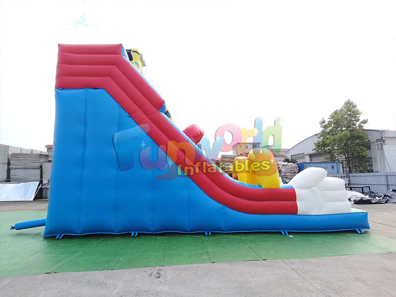 Grand toboggan gonflable Un design enfantin et ludique. La partie supérieure arbore un adorable Minion, personnage de dessin animé au corps rond et jaune, vêtu d'une salopette bleue, avec de grands yeux brillants et les bras tendus. Les couleurs sont riches et harmonieuses. Un toboggan blanc immaculé traverse le centre, bordé de superbes arches rouges. Les zones d'escalade de part et d'autre du toboggan présentent des couleurs contrastées. Le revêtement de sol du bas, composé d'un système gonflable à dégradé vert-jaune, garantit une glisse sûre et confortable.