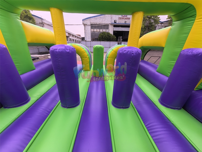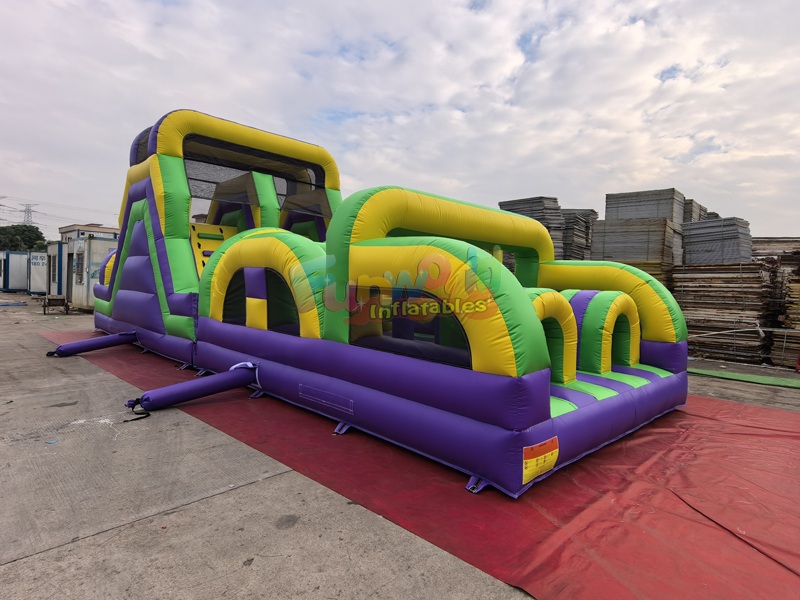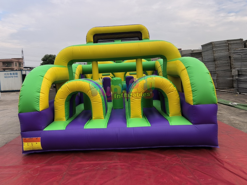 Ce42 pieds de long château gonflable parcours d'obstacles pour adultesCe parcours d'obstacles gonflables promet des heures d'amusement à vos invités ! Dès le départ, les participants devront franchir une multitude d'obstacles, notamment un mur d'escalade ludique, avant de dévaler les deux toboggans vertigineux de 7 mètres de haut. L'arrivée se situe au pied de ces deux toboggans ! Dominée par une palette de couleurs éclatantes – violet foncé, vert citron et jaune vif –, cette structure offre un défi visuellement captivant pour les participants de tous âges.
