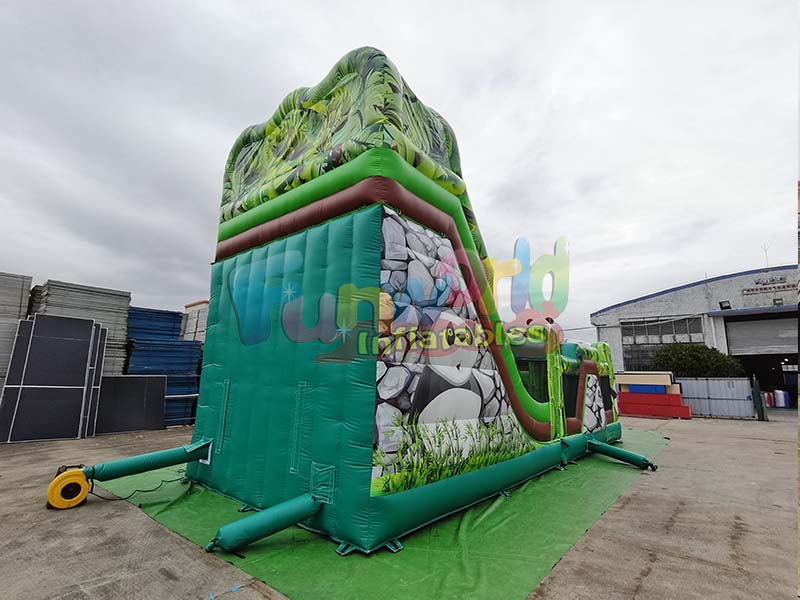 Panda toboggan gonflable en forme d'animaux Créant une ambiance de jungle luxuriante, ce toboggan est orné de plusieurs adorables pandas noirs et blancs, ce qui ajoute à son charme. Associant des motifs de plantes de jungle réalistes et des textures rocheuses au style cartoon, il dégage une impression de nature et de jeu. Son attrait visuel fort éveille facilement la curiosité et l'amusement des enfants.