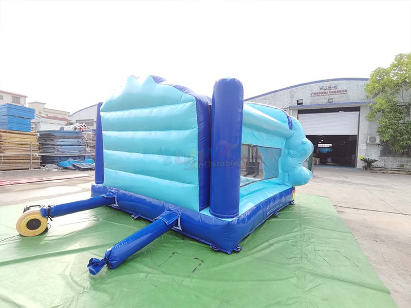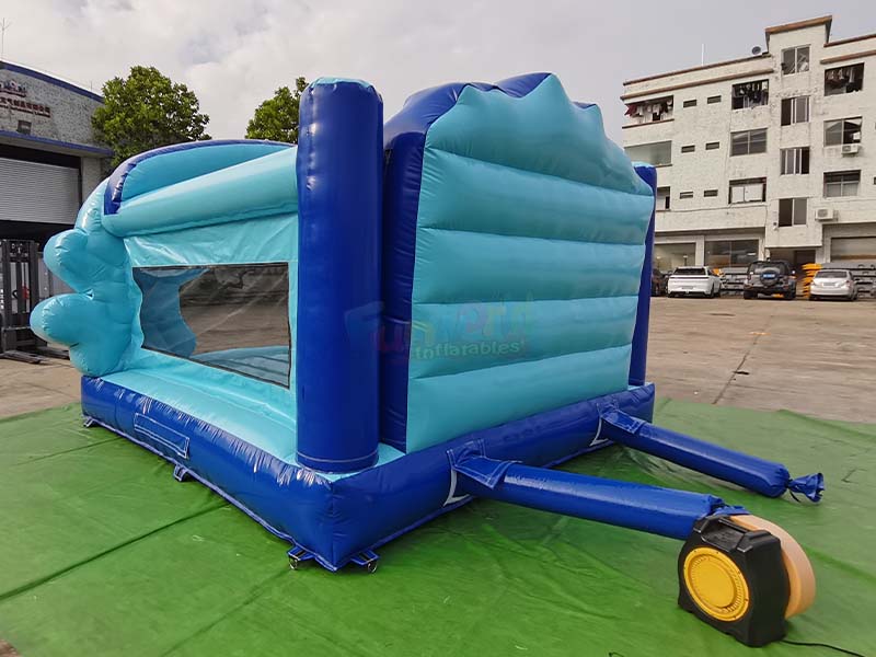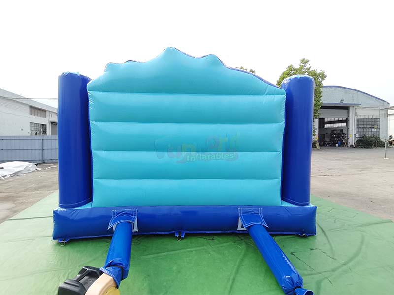 Château gonflable bleu pour tout-petits. Ses côtés sont constitués d'une structure gonflable à double couche : la structure principale supérieure bleu clair et la poutre porteuse inférieure bleu foncé forment un support stable. La surface de la poutre gonflable bleu foncé du bas est gaufrée à chaud, ce qui constitue une couche de renfort supplémentaire pour absorber les chocs au sol et prévenir l'usure et la déformation du fond.