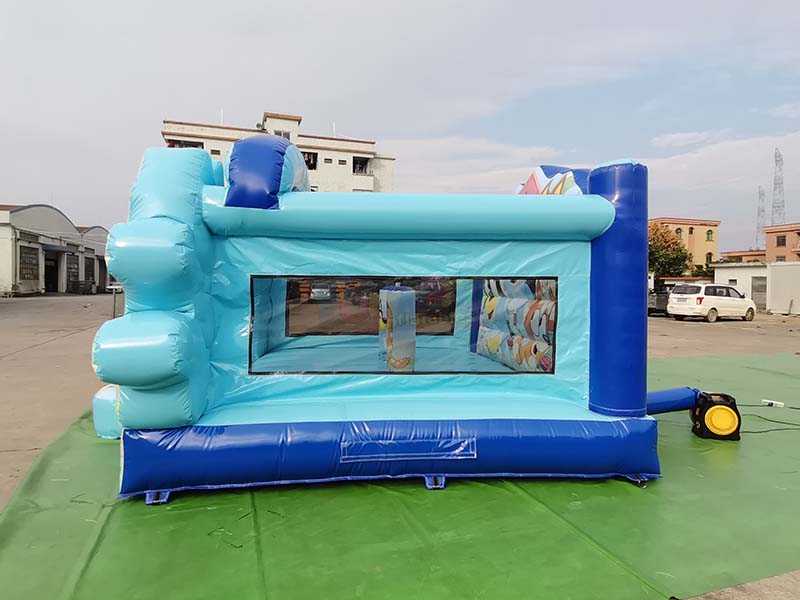 Trampoline gonflable Bluey. Sa surface est recouverte d'un motif régulier de picots longitudinaux en relief pour une meilleure adhérence et une sécurité accrue. Les bandes bleues, réparties à intervalles réguliers, sont des renforts professionnels, solidement fixés à la surface de saut par thermoscellage. Ces renforts répartissent l'impact des sauts, prévenant ainsi efficacement toute déformation ou étirement après une utilisation prolongée et améliorant considérablement la résistance et la durée de vie du trampoline.