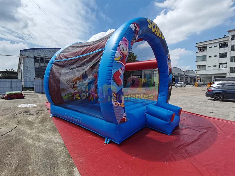 Sonic-themed trampoline inflatable bounce house. Its distinctive appearance incorporates elements of the IP, featuring vibrant blue as the main color with red accents. The arched entrance at the front displays yellow lettering, while the arch and sides are covered with colorful patterns of classic cartoon characters like Sonic and Amy, creating a lively and dynamic anime-inspired look. The inflatable structure, with transparent mesh on the sides, ensures ventilation while allowing a clear view of the interior.