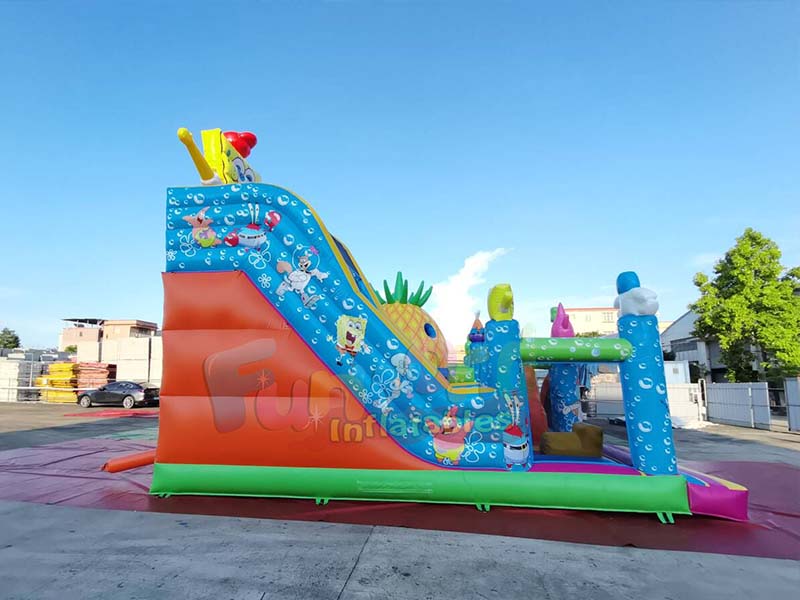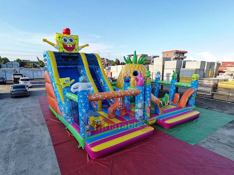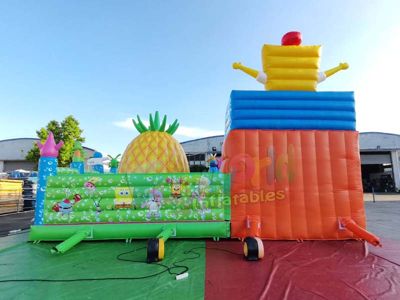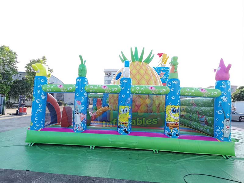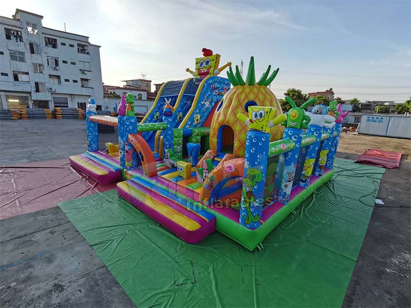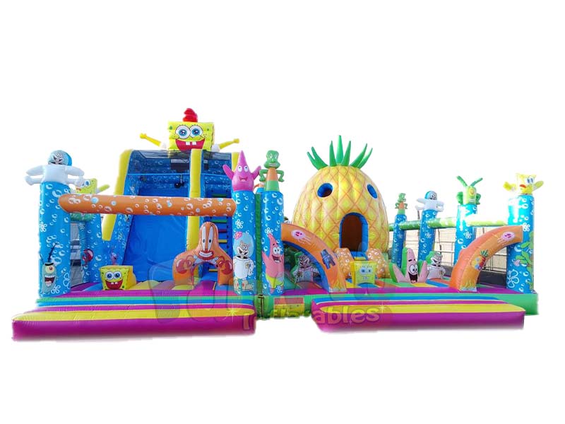 thème Bob l'éponge château gonflable extérieur Le design est une fusion parfaite entre fantaisie et esthétique visuelle. Il s'inspire de l'univers classique de Bob l'éponge, avec une palette de couleurs puisant son inspiration dans le monde marin.L'emblématique maison-ananas, avec sa forme tridimensionnelle saisissante, ses personnages de Bob l'Éponge, le haut du toboggan et des éléments rappelant Patrick et Carlo, sont stratégiquement placés dans tout le complexe, ravivant pleinement les souvenirs d'enfance liés à la franchise. Le complexe comprend un toboggan bleu orné de motifs Bob l'Éponge, donnant l'impression de voyager dans un monde sous-marin ludique. De multiples parcours d'obstacles et zones interactives sont intégrés entre les structures gonflables, créant un espace de jeu riche et varié qui recrée parfaitement l'atmosphère joyeuse de Bikini Bottom. Chaque détail extérieur contribue à une immersion totale dans l'univers amusant et exaltant de l'enfance.