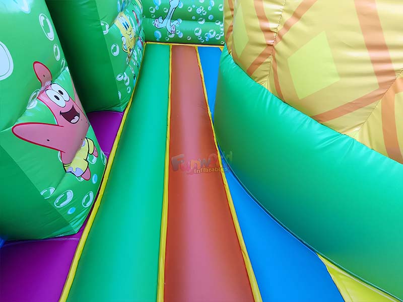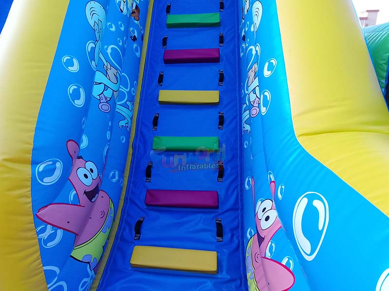 Le château gonflable géant Bob l'Éponge pour jardin présente une structure d'une grande finesse. Les marches orange gonflables à l'entrée de la maison ananas sont imprimées de points blancs, imitant la texture d'une éponge douce au toucher et immédiatement reconnaissable. Les modules gonflables sont dotés de coutures impeccables et les couleurs imprimées sont très saturées, avec des motifs tridimensionnels nets. Même de près, la finesse des couleurs et des formes est remarquable.