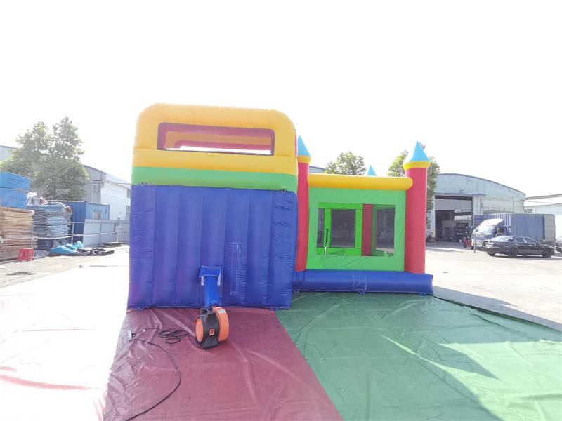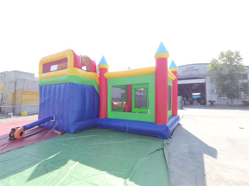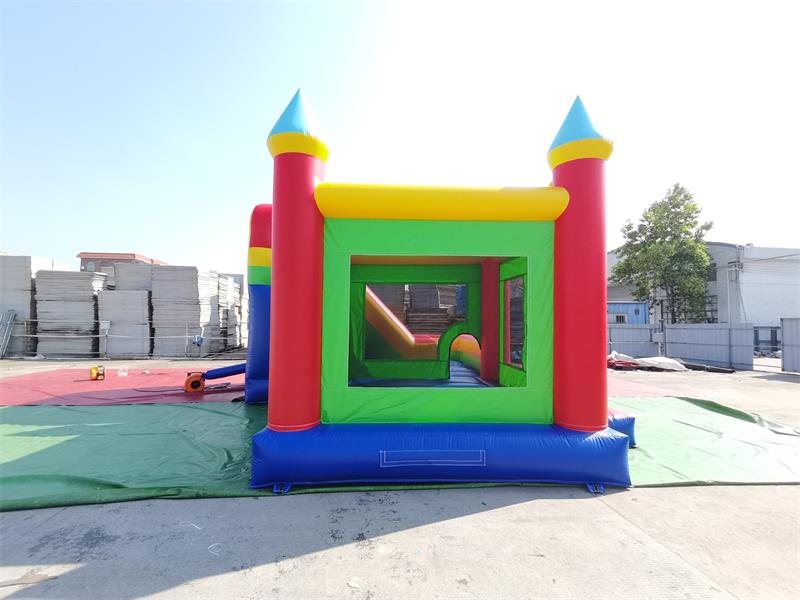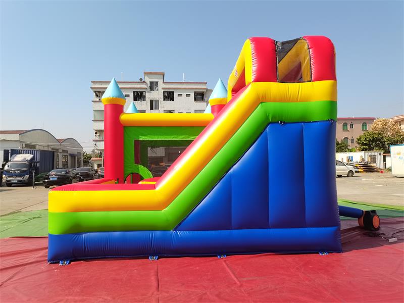 château gonflable commercial combinéAvec son design de château de conte de fées classique, l'espace trampoline comprend trois tours pointues soutenues par de robustes colonnes gonflables rouges et surmontées de flèches coniques bleu clair. Des fenêtres en filet transparent vert sont intégrées entre les tours, préservant ainsi l'atmosphère magique du château. Sur la droite se trouve un toboggan à double couche : la couche extérieure est ornée de rayures rouges et jaunes alternées, tandis que la couche intérieure est d'un bleu ciel éclatant, avec des bords de rampe soulignés de lignes jaune vif.